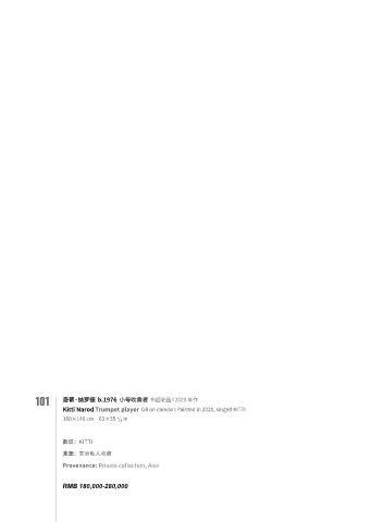 101 奇蒂·纳罗德 b.1976 小号吹奏者 布面油画 I 2020 年作 Kitti Narod Trumpet player Oil on canvas I Painted in 2020, singed KITTI 1 160×140 cm 63×55 / 8 in 款识:KITTI 来源:亚洲私人收藏 Provenance: Private collection, Aisa RMB 180,000-280,000