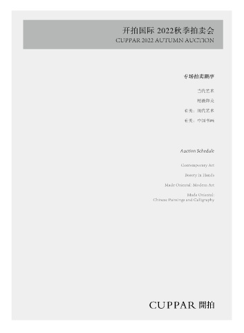 开拍国际 2022秋季拍卖会 CUPPAR 2022 AUTUMN AUCTION 专场拍卖顺序 当代艺术 精微即美 有美:现代艺术 有美:中国书画 Auction Schedule Contemporary Art Beauty in Hands Made Oriental: Modern Art Made Oriental: Chinese Paintings and Calligraphy