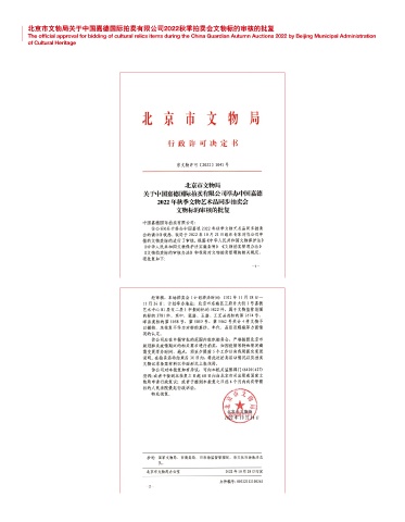 北京市文物局关于中国嘉德国际拍卖有限公司2022秋季拍卖会文物标的审核的批复 The official approval for bidding of cultural relics items during the China Guardian Autumn Auctions 2022 by Beijing Municipal Administration of Cultural Heritage