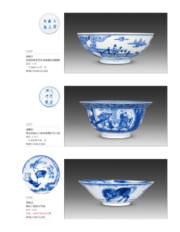 5286 清雍正 仿宣德青花苏东坡海棠诗意图碗 直径 D 20 “大清雍正年制”款 RMB:10,000-20,000 5287 清康熙 青花西厢记人物故事图折沿大碗 直径 D 20.2 “大清康熙年制”款 RMB:1,000-2,000 5288 清雍正 青花八骏图斗笠碗 直径 D 20 来源:国有文物商店旧藏 RMB:1,000-2,000