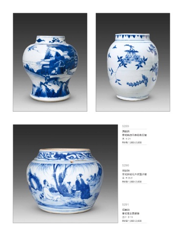 5289 清康熙 青花鹤鹿同春图将军罐 高 H 24 RMB:1,000-2,000 5290 明崇祯 青花折枝花卉纹莲子罐 高 H 26.6 RMB:1,000-2,000 5291 明崇祯 青花高士图粥罐 直径 D 19 RMB:1,000-2,000