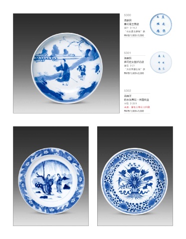 5300 清康熙 青花高士图盘 直径 D 15.2 “益友鼎玉雅制”款 RMB:1,000-2,000 5301 清康熙 青花仕女图折沿盘 直径 D 21 “大明宣德年制”款 RMB:1,000-2,000 5302 清雍正 仿永乐青花一束莲纹盘 直径 D 20.5 来源:国有文物公司旧藏 RMB:1,000-2,000