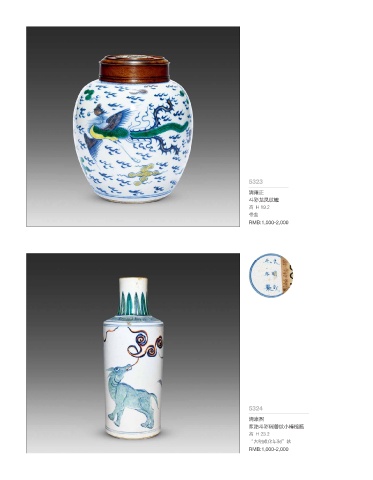 5323 清雍正 斗彩龙凤纹罐 高 H 19.2 带盖 RMB:1,000-2,000 5324 清康熙 浆胎斗彩瑞兽纹小棒槌瓶 高 H 23.2 “大明成化年制”款 RMB:1,000-2,000