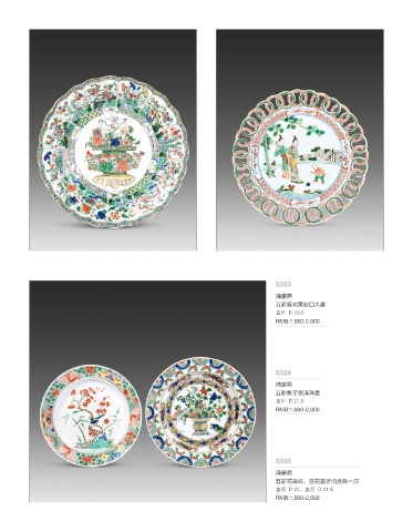 5333 清康熙 五彩篮花图花口大盘 直径 D 39.5 RMB:1,000-2,000 5334 清康熙 五彩教子图连环盘 直径 D 21.5 RMB:1,000-2,000 5335 清康熙 五彩花鸟纹、篮花图折沿盘各一只 直径 D 23、直径 D 21.5 RMB:1,000-2,000