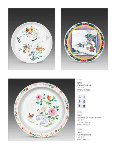5344 清雍正 粉彩富贵白头图大盘 直径 D 34 RMB:1,000-2,000 5345 清雍正 粉彩西厢记之长亭送别人物故事图洗 直径 D 26 “大清雍正年制”款 RMB:1,000-2,000 5346 清雍正 粉彩大吉图折沿大盘 直径 D 39.2 RMB:1,000-2,000