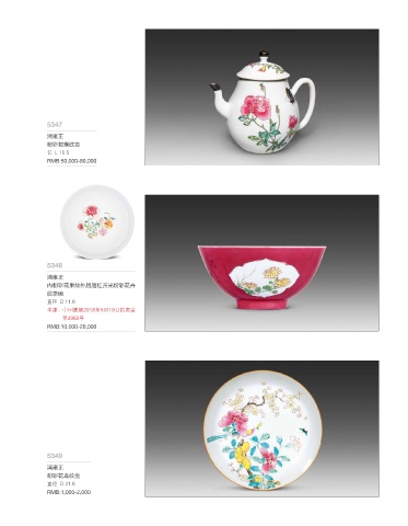 5347 清雍正 粉彩花蝶纹壶 长 L 15.5 RMB:50,000-80,000 5348 清雍正 内粉彩花果纹外胭脂红开光粉彩花卉 纹茶碗 直径 D 11.6 来源: 中国嘉德2018年5月19日拍卖会 第4963号 RMB:10,000-20,000 5349 清雍正 粉彩花鸟纹盘 直径 D 21.6 RMB:1,000-2,000