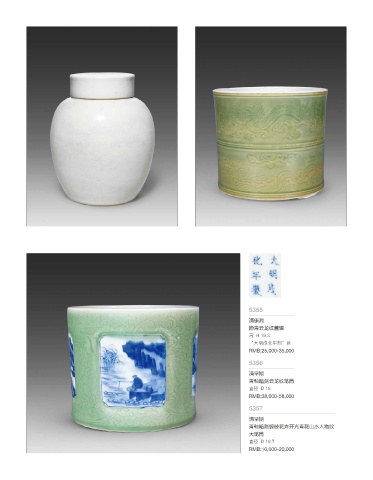 5355 清康熙 隐青云龙纹盖罐 高 H 19.3 “大明成化年制”款 RMB:25,000-35,000 5356 清早期 青釉暗刻云龙纹笔筒 直径 D 18 RMB:38,000-58,000 5357 清早期 青釉暗刻缠枝花卉开光青花山水人物纹 大笔筒 直径 D 19.7 RMB:10,000-20,000