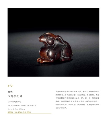 412 明代 此器由通体带皮的白玉雕琢而成,皮沁恰好作为兔子的 玉兔手把件 外表使用。兔子成趴卧状,挺胸昂首,双耳向后,面部 由几道简单的线条刻画出鼻子、吻、腮、眼,神韵刻画 MING PERIOD 准确 。四肢侧面以粗旷线条刻画出大腿的肌肉部分 , 并饰以短阴险以表示毛发。四肢并拢,用几道阴线刻画 JADE RABBIT HANDLE PIECE 出爪子的形状。 H:4cm;L:5cm;W:2cm RMB: 10,000-30,000