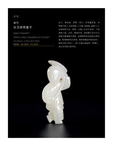 清代 白 玉 , 无 瑕 疵 , 圆 雕 一 童 子 , 手 持 莲 叶 茎 , 荷