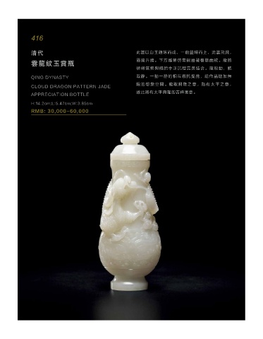 416 清代 此器以白玉雕琢而成,一龙盘转而上,流云飞溅, 云龙纹玉赏瓶 霞蔼升腾。下方雕琢仿青铜器饕餮兽面纹。龙的 磅 礡 气势与瓶的中正沉稳完美结合。龙取动,瓶 QING DYNASTY 取静。一动一静的相互衬托提携,给作品增加无 限的想象空间。龙取兴隆之意,瓶有太平之意, CLOUD DRAGON PATTERN JADE 故此器有太平兴隆的吉祥寓意。 APPRECIATION BOTTLE H:14.2cm;L:5.47cm;W:3.85cm RMB: 30,000-60,000