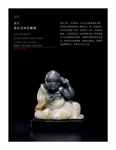黑白玉俏色罗汉 浅色部分雕琢罗汉袍,罗汉手持一铎,振铎而听,