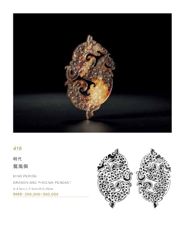 418 明代 龙凤佩 MING PERIOD DRAGON AND PHOENIX PENDANT H:4.5cm;L:7.6cm;W:0.45cm RMB: 200,000-300,000