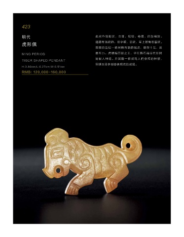 423 明代 此虎作匍匐状,立耳,低头,卷尾,四肢粗壮。 虎形佩 通体布满纹饰,臣字眼,羽纹,耳上附有卷云纹。 整体造型似一只伺机而动的猛虎,动态十足,刻 MING PERIOD 画有力。虎号称百兽之王,早在新石器时代即开 始被人神话。并与龙一样成为人们崇拜的神兽, TIGER SHAPED PENDANT 早期玉器多刻意表现虎的威猛。 H:3.86cm;L:6.27cm;W:0.51cm RMB: 120,000-160,000