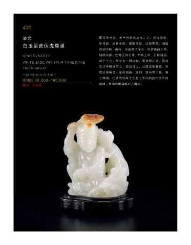 白玉留皮伏虎罗汉 柳月 眉,高鼻 小嘴,双 眼微敛, 法相慈 悲,须髯
