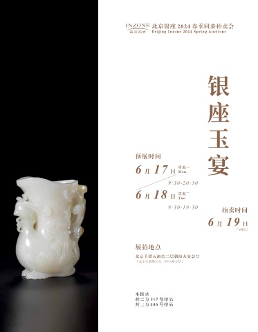 北京银座 2024 春季同步拍卖会 Beijing Inzone 2024 Spring Auctions 座 银 玉 宴 预展时间 6 月 17 日 星期一 Mon. 9:30-20:30 星期二 6 月 18 日 Tue. 9:30-19:30 拍卖时间 6 月 19 日 「星期三」 展拍地点 北京千禧大酒店二层朝阳大宴会厅 「北京市朝阳区东三环中路七号」 本图录 封二为 517 号拍品 封三为 486 号拍品
