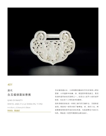 WHITE JADE FU LU SHOU RU YI PEI 是件透雕如意配为一件精工细作的玉雕作品,玉质致密