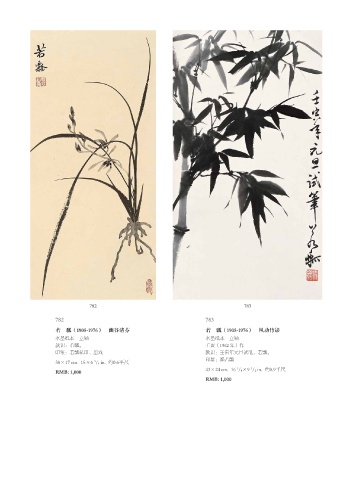 782 783 782 783 若 瓢(1905-1976) 幽谷清芬 若 瓢(1905-1976) 风动竹影 水墨纸本 立轴 水墨纸本 立轴 款识:若瓢。 壬寅(1962 年)作 印鉴:若瓢私印、墨戏 款识:壬寅年元旦试笔,若瓢。 印鉴:释若瓢 3 38×17 cm. 15×6 /4 in. 约0.6平尺 7 1 RMB: 1,000 43×24 cm. 16 /8×9 /2 in. 约0.9平尺 RMB: 1,000