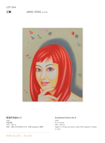 LOT 644 江衡 JIANG HENG (b.1972) 散落的物品No.5 Scattered Items No.5 2006 2006 布面油画 Oil on canvas 165 × 135 cm 165 × 135 cm 签名:江衡 JIANGHENG.2006;江衡 jiangheng(背签) Signed in Chinese and pinyin, dated 2006; signed in Chinese on verso RMB 30,000 - 60,000
