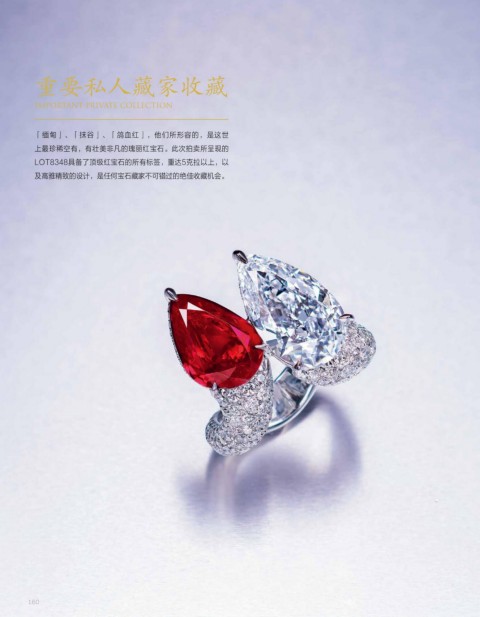 重要私人藏家收藏 IMPORTANT PRIVATE COLLECTION 「缅甸」、「抹谷」、「鸽血红」,他们所形容的,是这世 上最珍稀空有,有壮美非凡的瑰丽红宝石。此次拍卖所呈现的 LOT8348具备了顶级红宝石的所有标签,重达5克拉以上,以 及高雅精致的设计,是任何宝石藏家不可错过的绝佳收藏机会。 160