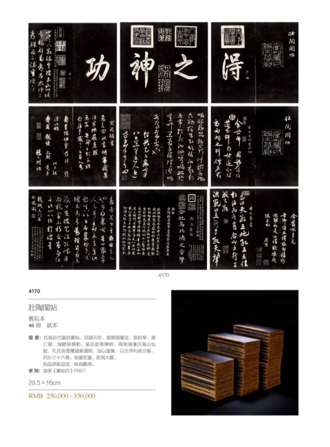 4170 4170 壮陶阁帖 旧拓本 46 册 纸本 提 要:此为近代汇刻丛帖。民国元年,裴景福鉴定,张松亭、唐 仁斋、淘听泉模勒。裴氏官粤东时,得南海潘氏海山仙 馆、孔氏岳雪楼诸家遗物,加以汇集,以元亨利贞分集, 共计三十六卷。收罗宏富,蔚为大观。 拍品原装品佳,殊为难得。 参 阅:容庚《丛帖目》P867 29.5×16cm RMB 250,000 - 350,000