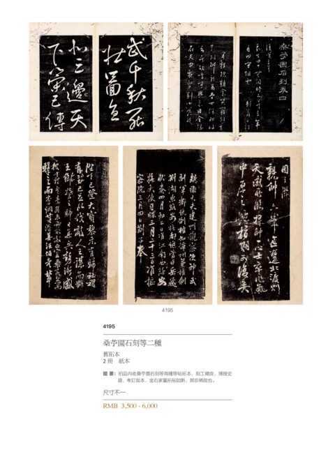 4195 4195 桑苧园石刻等二种 旧拓本 2 册 纸本 提 要:拍品内收桑苧园石刻等两种等帖拓本,刻工精良,博搜史 证,考订版本,金石家重拓帖如斯,其珍稀故也。 尺寸不一 RMB 3,500 - 6,000