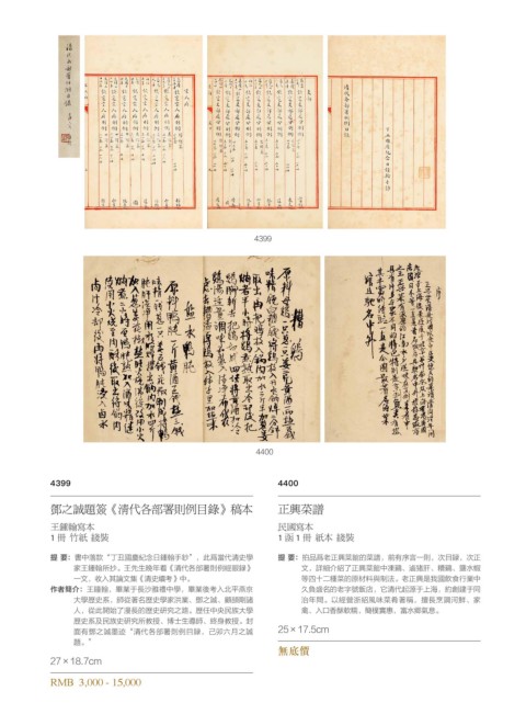 提 要:书中落款“丁丑国庆纪念日锺翰手钞”,此为当代清史学 提 要:拍品为老正兴菜馆的菜谱,前有序言一则,次目录,次正