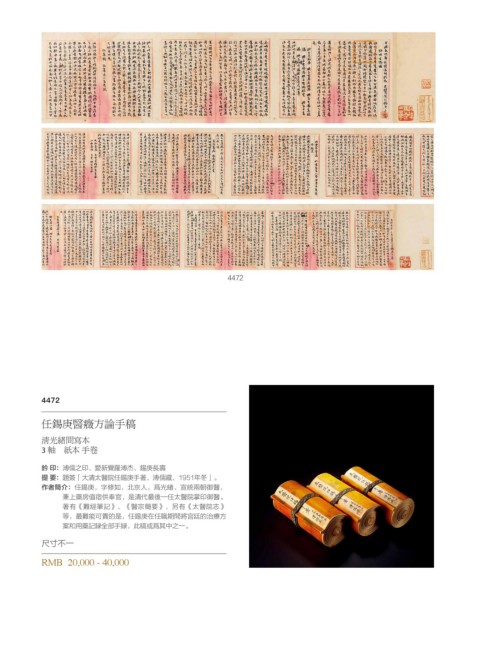 4472 4472 任锡庚医症方论手稿 清光绪间写本 3 轴 纸本 手卷 钤 印:溥儒之印、爱新觉罗溥杰、锡庚长寿 提 要:题签「大清太医院任锡庚手著,溥儒藏,1951年冬」。 作者简介:任锡庚,字修如,北京人,为光绪、宣统两朝御医, 兼上药房值宿供奉官,是清代最后一任太医院掌印御医。 著有《难经笔记》、《医宗简要》,另有《太医院志》 等,最难能可贵的是,任锡庚在任职期间将宫廷的治疗方 案和用药记录全部手录,此稿或为其中之一。 尺寸不一 RMB 20,000 - 40,000