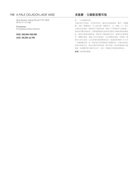 768 A PALE CELADON JADE VASE 清嘉慶·玉雕獸面雙耳瓶