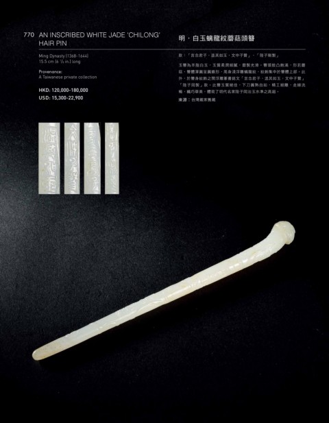 770 AN INSCRIBED WHITE JADE 'CHILONG' 明·白玉螭龍紋蘑菇頭簪
