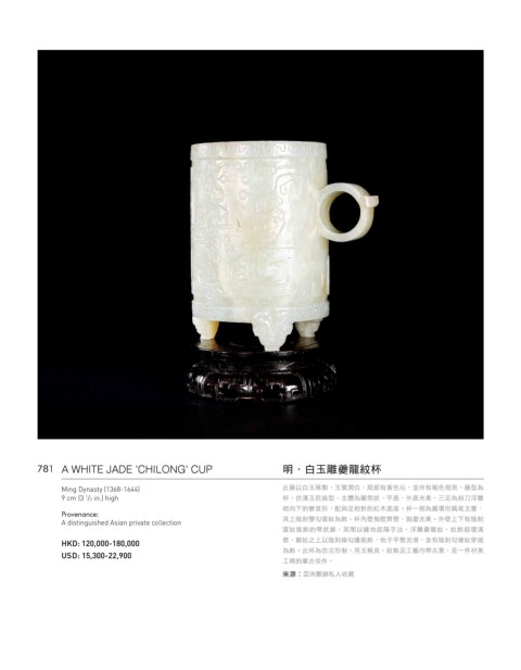 781 A WHITE JADE 'CHILONG' CUP 明·白玉雕夔龍紋杯