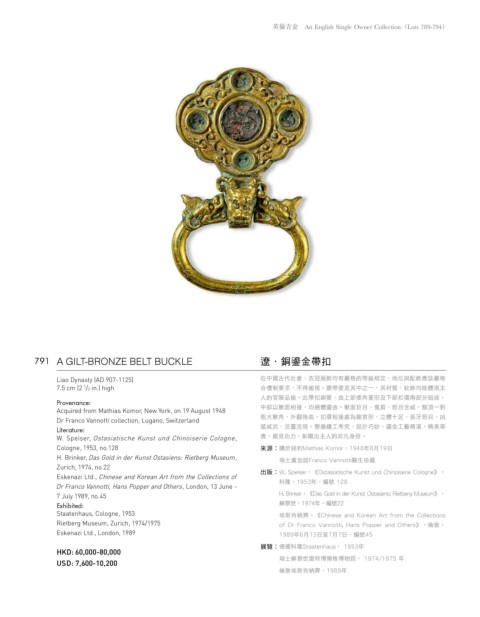 791 A GILT-BRONZE BELT BUCKLE 遼·銅鎏金帶扣
