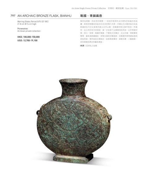 797 AN ARCHAIC BRONZE FLASK, BIANHU 戰國·青銅扁壺