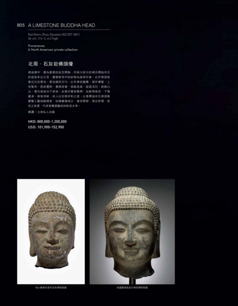像石灰岩質地,質地縝密均勻。此件佛首圓雕,頭作螺髻,上