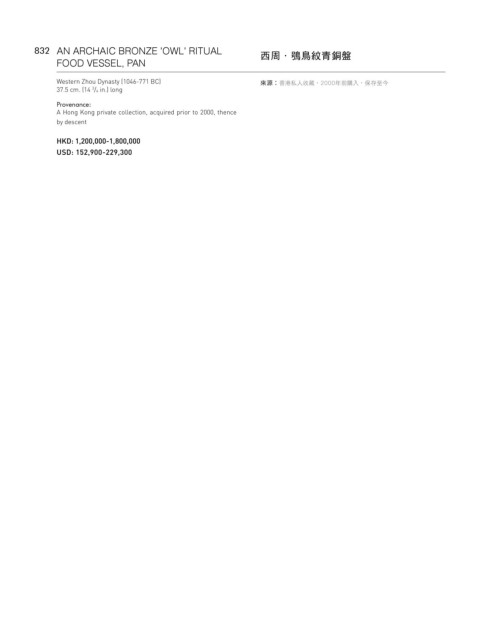 832 AN ARCHAIC BRONZE 'OWL' RITUAL 西周·鴞鳥紋青銅盤
