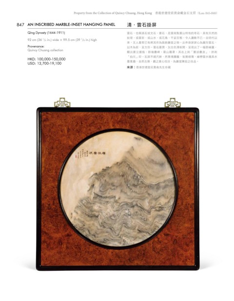 847 AN INSCRIBED MARBLE-INSET HANGING PANEL 清·雲石掛屏
