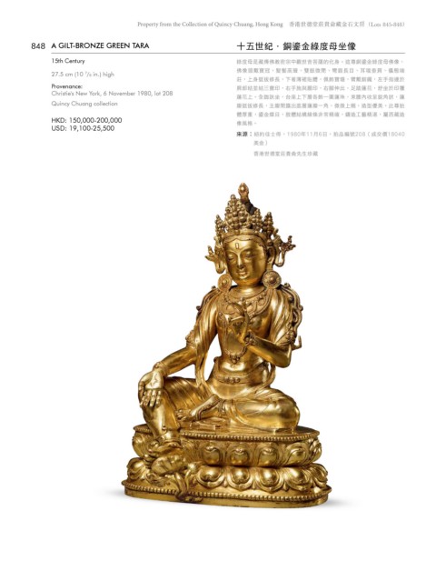 848 A GILT-BRONZE GREEN TARA 十五世纪·銅鎏金綠度母坐像