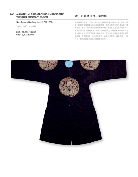 'DRAGON' SURCOAT, GUNFU 清·石青地日月二章袞服