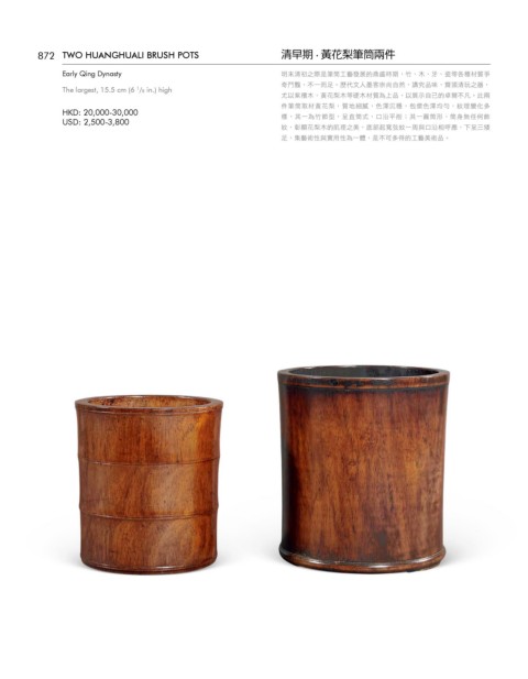 872 TWO HUANGHUALI BRUSH POTS 清早期 · 黃花梨筆筒兩件
