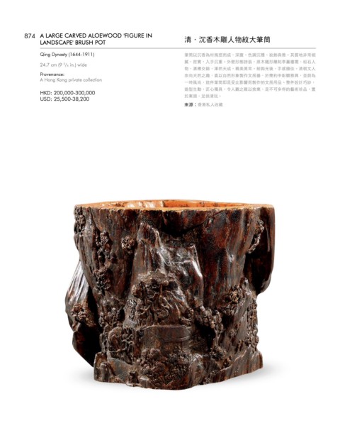 Qing Dynasty (1644-1911) 筆筒以沉香為材掏挖而成,深腹,色調沉穩,紋飾典雅。其質地非常細