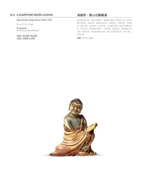 875 A SOAPSTONE SEATED LUOHAN 清康熙·壽山石雕羅漢