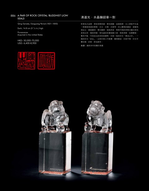 Qing Dynasty, Daoguang Period (1821-1850) 對章為水晶質,章型規整高瘦,質地細膩、晶瑩剔透,古人曾賦予水晶