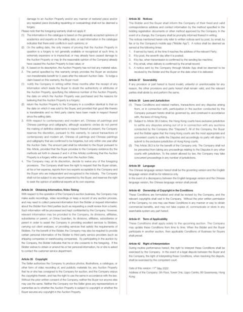 The Company shall not bear any liability for the failure to duly complete or submit the 1. To take out insurance coverage for the Auction Property and/or store the same With respect to the operation of the Company’s auction business, the Company may These Conditions are formulated and shall be revised by the Company, and the
