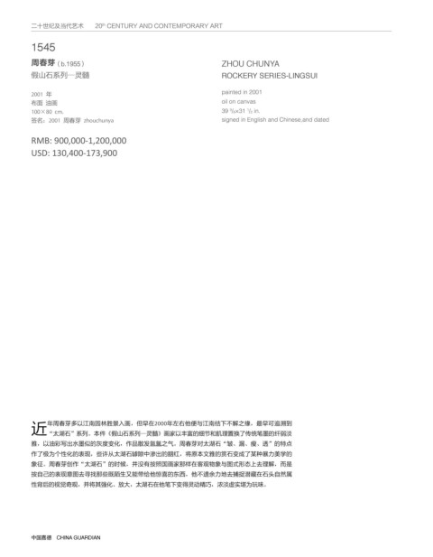 雅,以油彩写出水墨似的灰度变化,作品散发氤氲之气。周春芽对太湖石“皱、漏、瘦、透”的特点