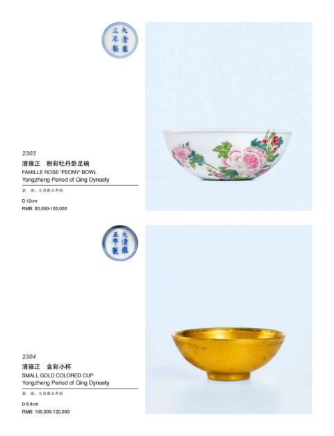 2303 清雍正 粉彩牡丹卧足碗 FAMILLE ROSE 'PEONY' BOWL Yongzheng Period of Qing Dynasty 款 识:大清雍正年制 D:12cm RMB: 80,000-100,000 2304 清雍正 金彩小杯 SMALL GOLD COLORED CUP Yongzheng Period of Qing Dynasty 款 识:大清雍正年制 D:6.8cm RMB: 100,000-120,000