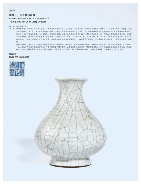 贵而世绝无之,官、哥、宣、定为当今第一珍品。」雍正皇帝艺术品味高雅,精于鉴赏,宋瓷不事雕琢的自然之美深得其青睐,故官窑器物深受影响,