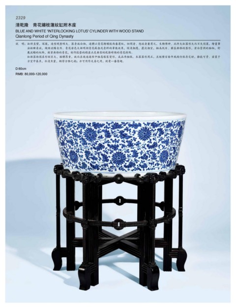说 明:缸斜直壁,深腹,造型规整硕大。器身施白釉,通体以青花绘缠枝西番莲纹,初开者、怒放者兼有之,生动传神。此件大缸器形大而不失俏丽,绘画笔