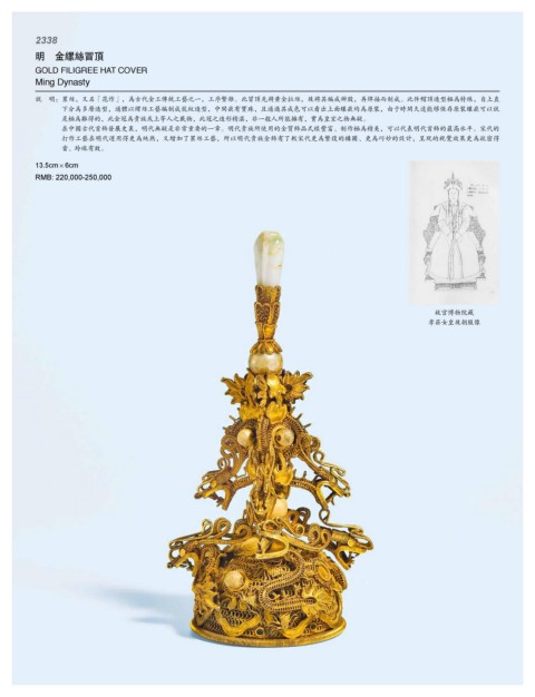 下分为多层造型,通体以缧丝工艺编制成龙纹造型,中间嵌有宝珠,且通过其成色可以看出上面镶嵌均为原装,由于时间久远能够保存原装镶嵌可以说
