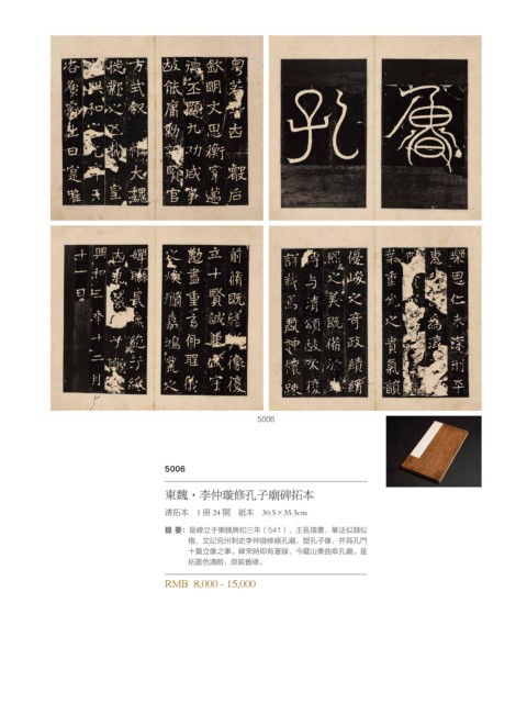 5006 5006 东魏·李仲璇修孔子庙碑拓本 清拓本 1 册 24 开 纸本 30.5×35.5cm 提 要:是碑立于东魏兴和三年(541),王长孺书,笔法似隶似 楷,文记兖州刺史李仲璇修缮孔庙,塑孔子像,并为孔门 十贤立像之事。碑宋时即有著录,今藏山东曲阜孔庙。是 拓墨色清朗,原装旧裱。 RMB 8,000 - 15,000