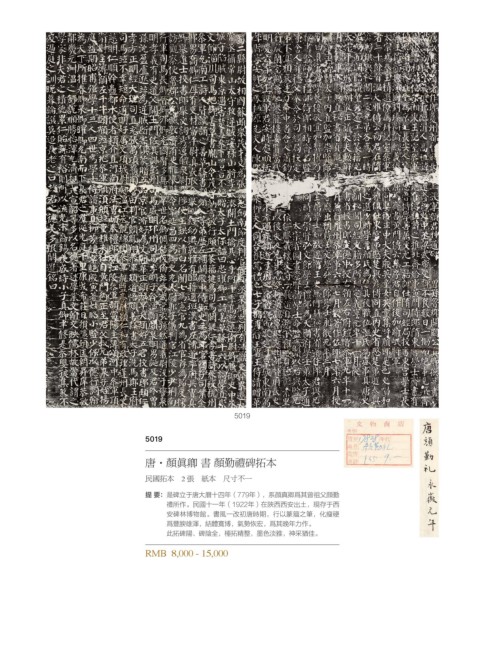 5019 5019 唐·颜真卿 书 颜勤礼碑拓本 民国拓本 2 张 纸本 尺寸不一 提 要:是碑立于唐大曆十四年(779年),系颜真卿为其曾祖父颜勤 礼所作。民国十一年(1922年)在陕西西安出土,现存于西 安碑林博物馆。书风一改初唐时期,行以篆籀之笔,化瘦硬 为丰腴雄浑,结体宽博,气势恢宏,为其晚年力作。 此拓碑阳、碑阴全,棰拓精整,墨色淡雅,神采犹佳。 RMB 8,000 - 15,000