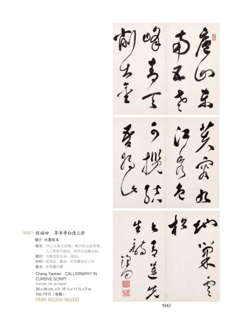 1042 / 程瑶田 草书李白诗三开 镜片 水墨纸本 释文:庐山东南五老峰,青天削出金芙蓉。 九江秀色可揽结,吾将此地巢云松。 题识:书青莲先生诗,瑶田。 钤印:程瑶田、葺翁、名虽葺翁实少年 备注:李煜瀛旧藏 Cheng Yaotian CALLIGRAPHY IN CURSIVE SCRIPT framed; ink on paper 3 26×30 cm.×3 10 /4×11 /4×3 in. 1 约0.7平尺(每幅) RMB: 60,000-80,000 1042